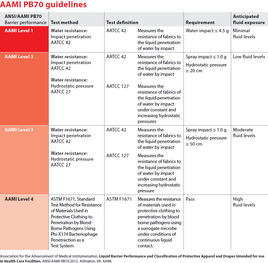 The ANSI/AAMI PB70 standard has 4 levels of fluid barrier protection, with Level 1 being the lowest level of protection and Level 4 being the highest. The following is a table showing the different levels of rated gowns, test methods, and the anticipated fluid exposure for each performance level.